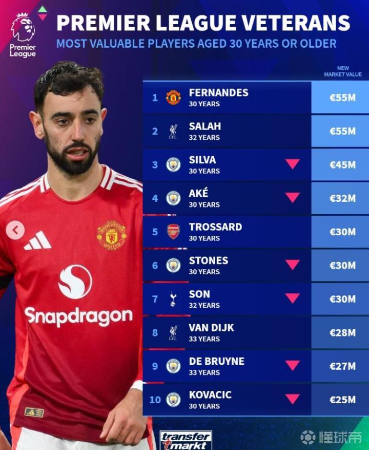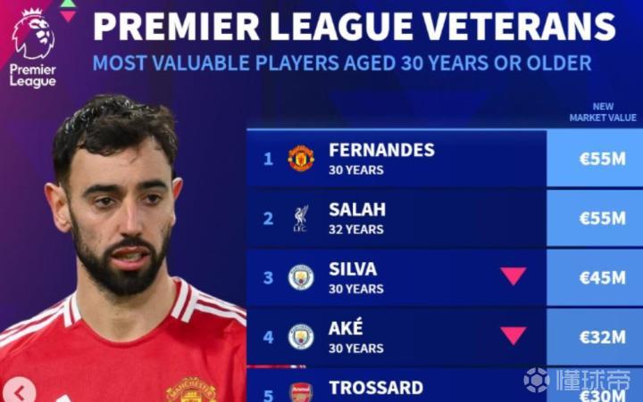 最新一期的德转更新了英超球员身价,特别列出了年龄在30岁以上的球员的身价排名榜单。在这份榜单中,曼联的B费和利物浦的萨拉赫以5500万欧元的身价居于榜首,成为了焦点。